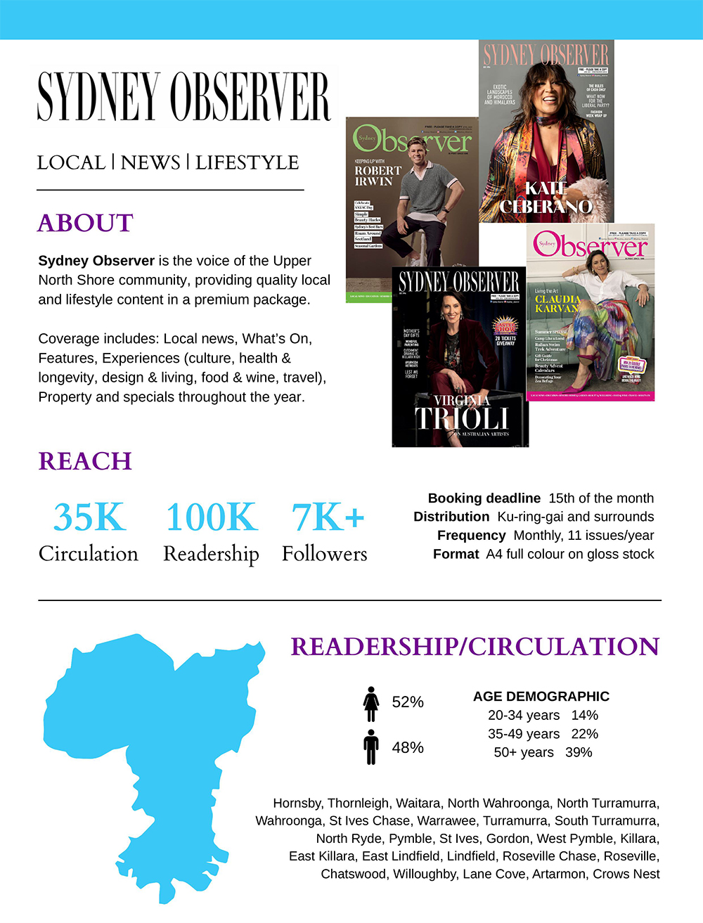 Our Sydney Observer Media Kit has all the information you need to plan and prepare an advertising campaign in the magazine. Contact us on advertising@kamdha.com.